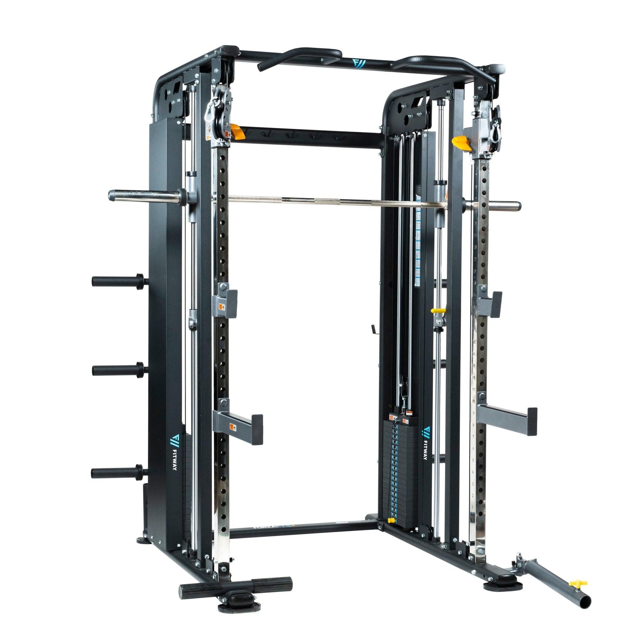 | Special Features | Smith bar, J-hooks, Safety spotter arms, dip attachment, landmine attachment, rowing foot pedal, barbell storage, chin up bar |